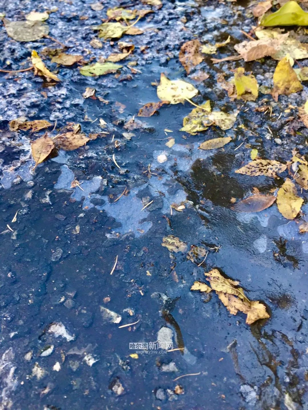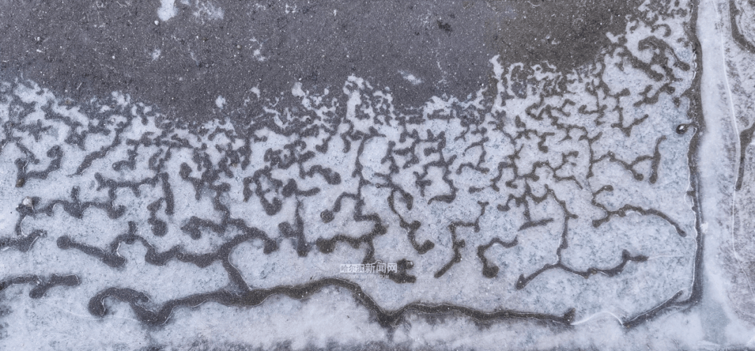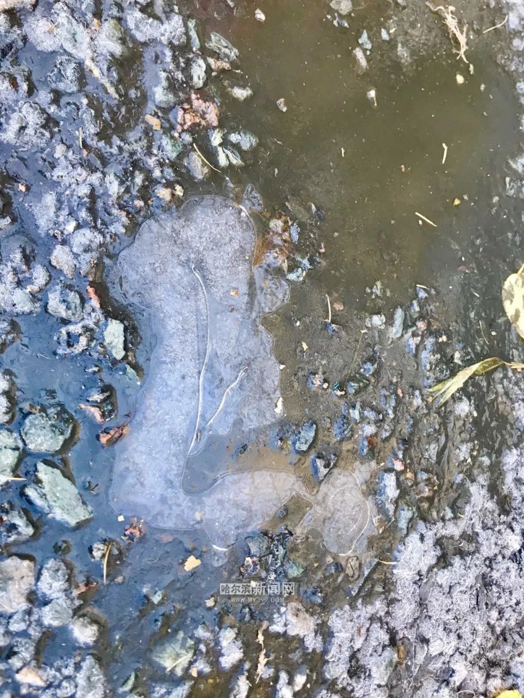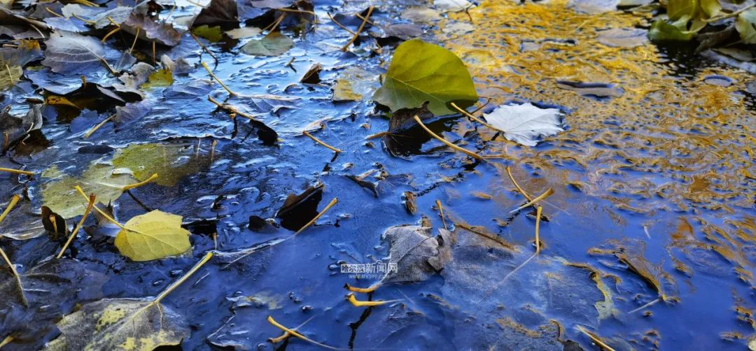 冰面下各种枯枝败叶与冰面构成的独特图案,给北国冰城的晚秋增添了不少亮色和韵味,形成一道美轮美奂的别样风景。