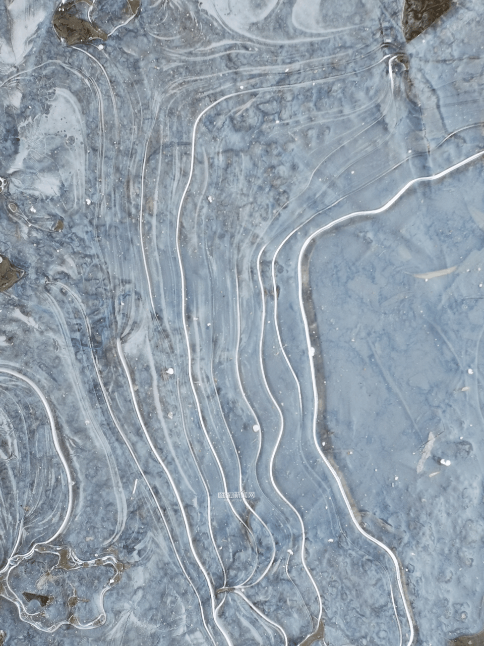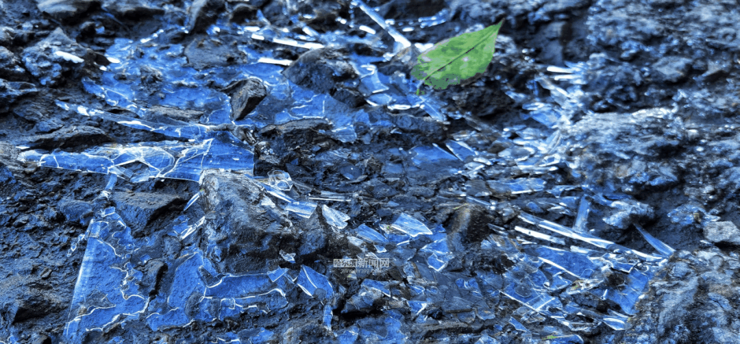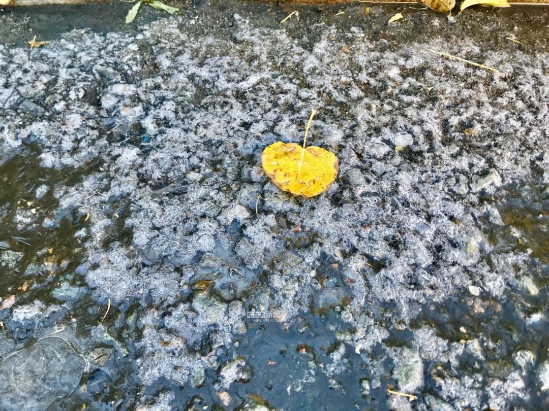 随着冷空气的到来,水面大面积结冰,冰面上随风散落的密密麻麻金色音符。