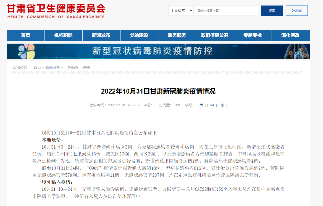 10月31日0—24时,甘肃省新增确诊病例3例,为无症状感染者转确诊病例,均在兰州市七里河区;