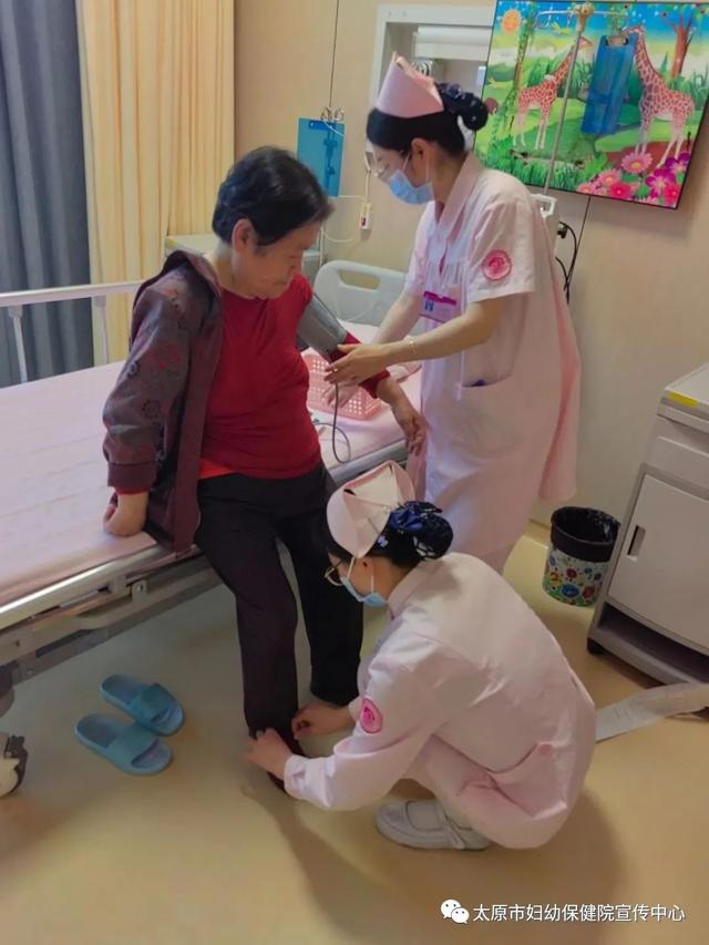 交班过程中,为避免老奶奶发生跌倒,李子娟护士为她系鞋带。
