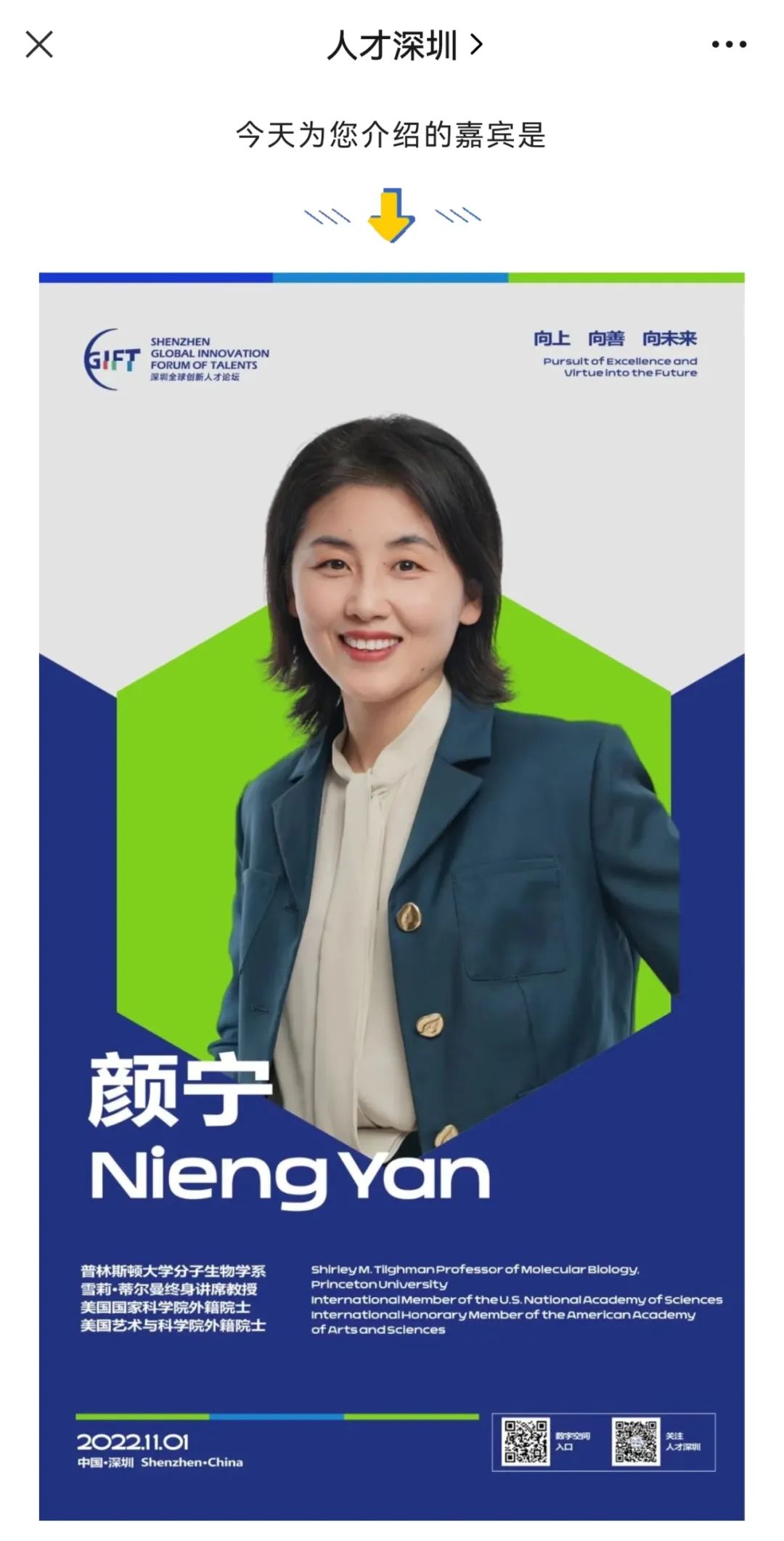 11月1日上午,在2022深圳全球创新人才论坛上,结构生物学家颜宁宣布,即将辞去普林斯顿大学教职,出任深圳医学科学院创始院长。
