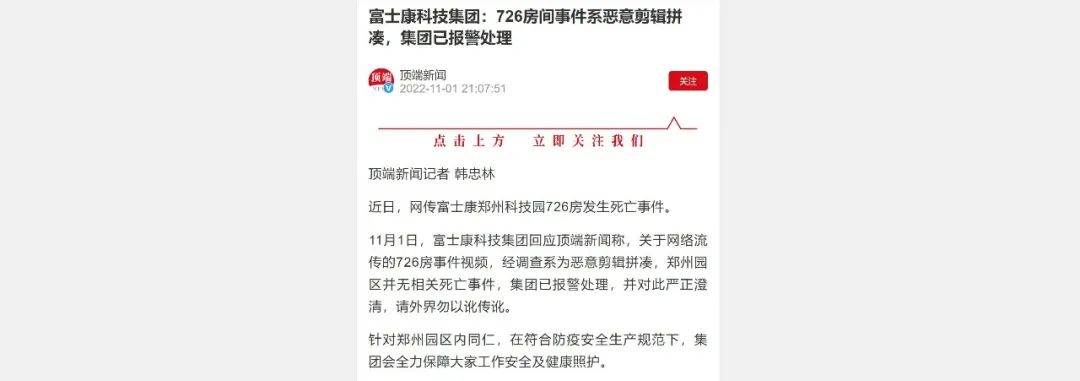 11月1日,富士康科技集团回应河南日报“顶端新闻”称,关于网络流传的726房事件视频,经调查系为恶意剪辑拼凑,郑州园区并无相关死亡事件,集团已报警处理,并对此严正澄清,请外界勿以讹传讹。