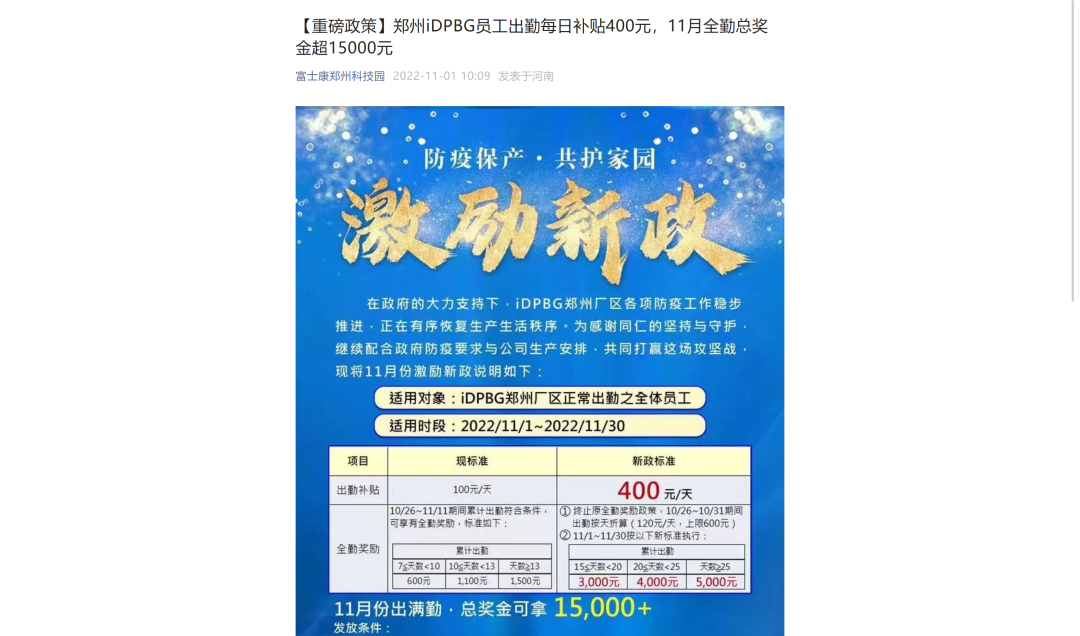 同日,富士康郑州科技园发布“激励新政”:郑州iDPBG员工出勤每日补贴从100元涨至400元,11月全勤总奖金超15000元。