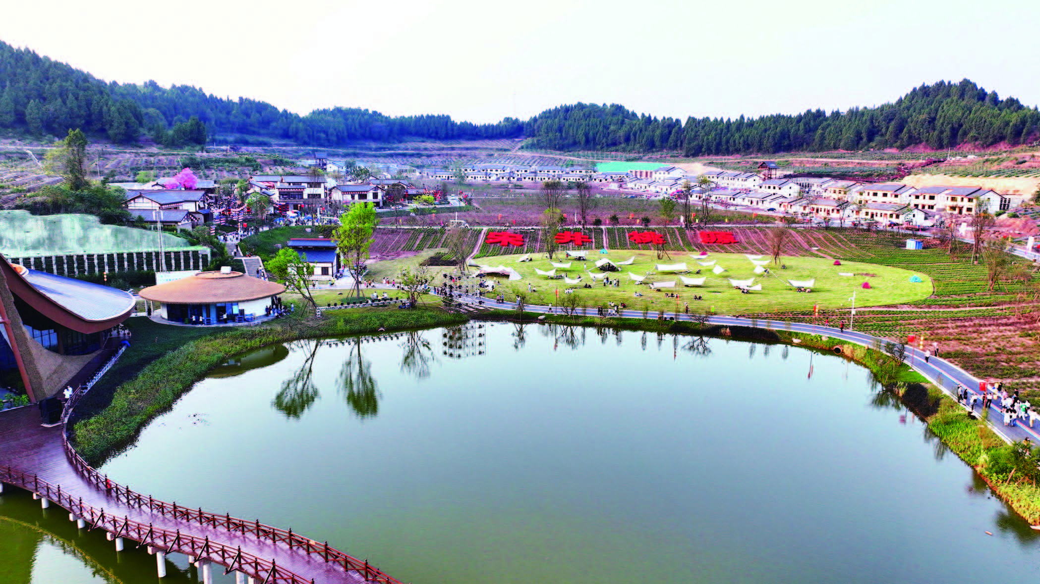 端稳“绿饭碗”,打造一步一景“宜居乡村”。创建具有大英特色、时代特征、创新特质的巴蜀美丽乡村建设标杆。以生态为底色。在保护大地景观原真性、整体性和乡土性的同时,深挖乡村四季的不同美景,栽培应季作物、配好大地景观。同时,因地制宜优化村落、田园、植被、道路等空间要素,做好农村田园化、产业特色化、庭院果蔬化、大地景观化、城乡一体化“五化”文章,实施农村“厕所革命”补短板行动,增强当地群众的获得感和幸福感。以文化为亮色。农房立面改造、聚居新村建设和公共服务建筑改造,融入宋朝建筑屋角起翘、梁柱斗拱铺排等宋风宋韵,保留乡村空间肌理,配套文化石外墙、灯笼排架、田间栈道、青砖石桥,还原宋代村落场景。村里上世纪70、80、90年代修建的砖混房子甚至土坯房,得以全面整治改造或重建,水系、道路、院落、田土等也得以统一改造提升,变身韵味独具的宋风村落群。