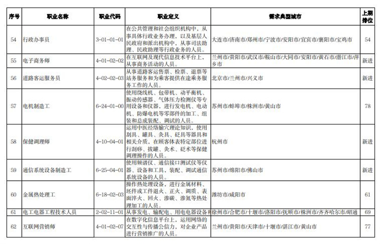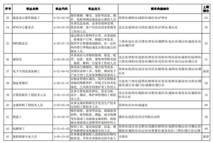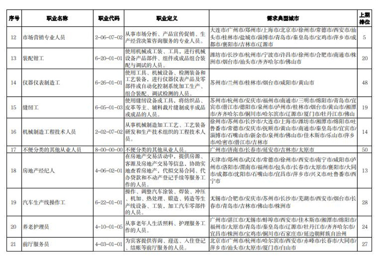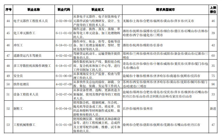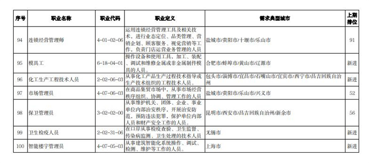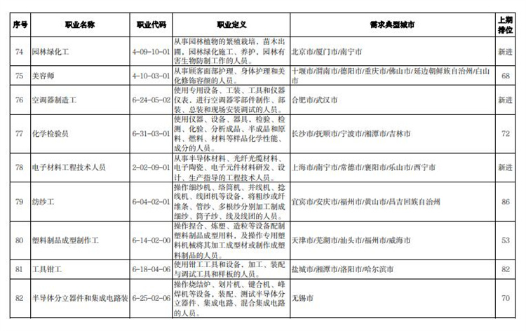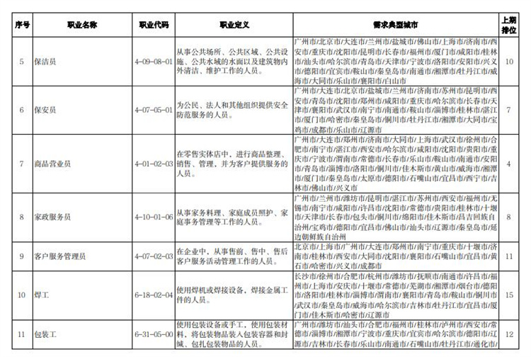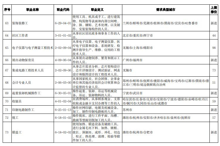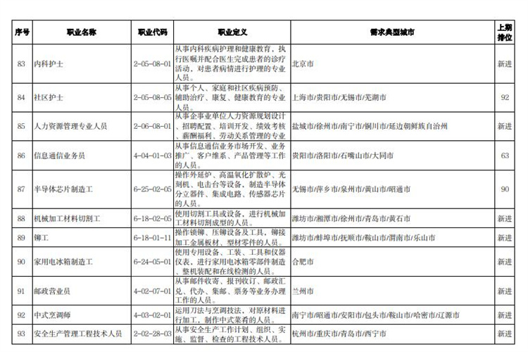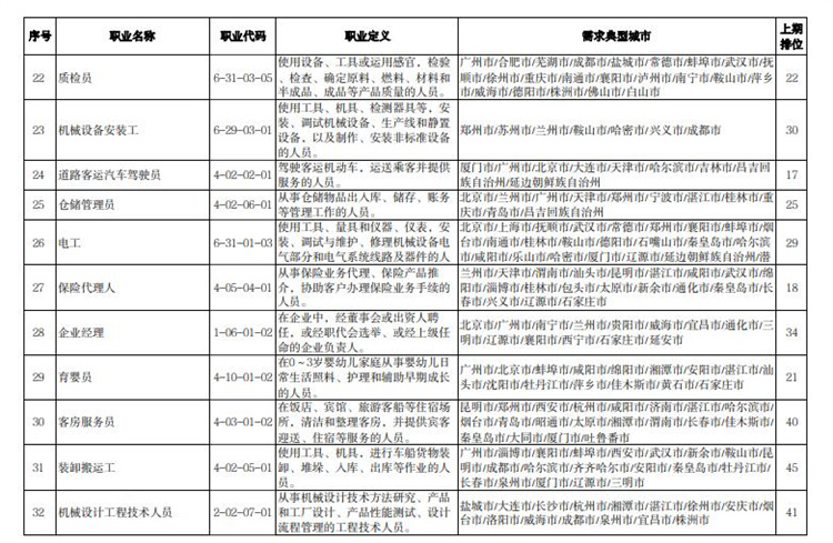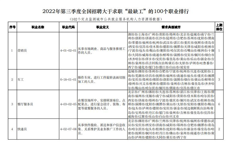 中国网11月2日讯 据人力资源和社会保障部消息,为更好服务于用人单位招聘用工和劳动者应聘求职,同时为职业技能培训工作提供数据参考,中国就业培训技术指导中心近期组织102个定点监测城市公共就业服务机构,收集汇总2022年第三季度人力资源市场供求关系较为紧张的招聘、求职需求职业岗位信息,形成“2022年第三季度全国招聘大于求职‘最缺工’的100个职业排行”,并向社会公布。