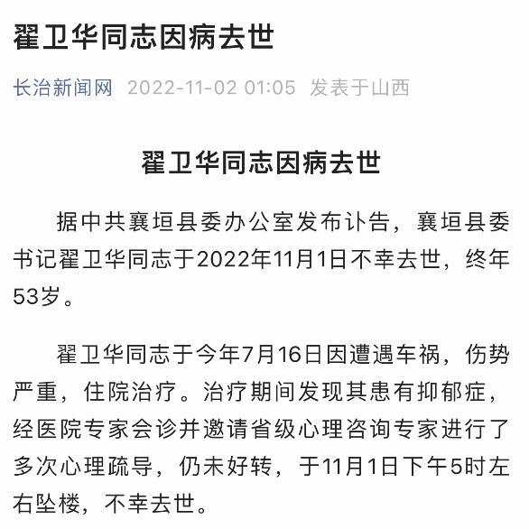 据中共襄垣县委办公室发布讣告,襄垣县委书记翟卫华同志于2022年11月1日不幸去世,终年53岁。