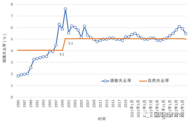 图3 以自然失业率为基准观察城镇失业率变化(1985-2022年5月)