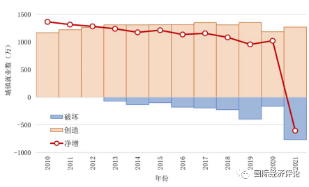 图2 中国城镇就业的创造、破坏和净增(2010-2021年)