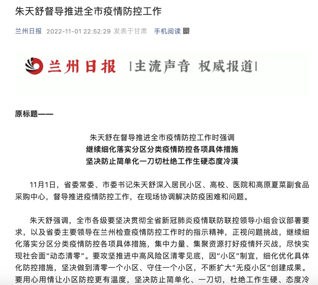 据@兰州日报 :11月1日,甘肃省委常委、兰州市委书记朱天舒深入居民小区、高校、医院和高原夏菜副食品采购中心,督导推进疫情防控工作,在现场协调解决防疫困难和问题。