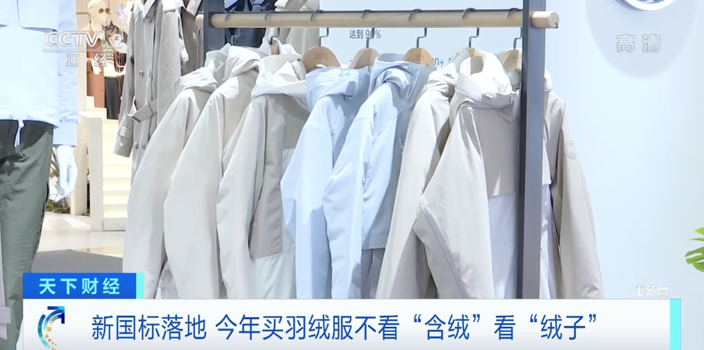 记者来到江苏南京新街口商业区,销售人员介绍,十月下旬,羽绒服销量逐步上升。今年4月起,羽绒新国标正式实施,最大亮点是把“含绒量”修改为“绒子含量”。记者翻看了一件羽绒服的吊牌,吊牌上已经没有“含绒量”的标注。