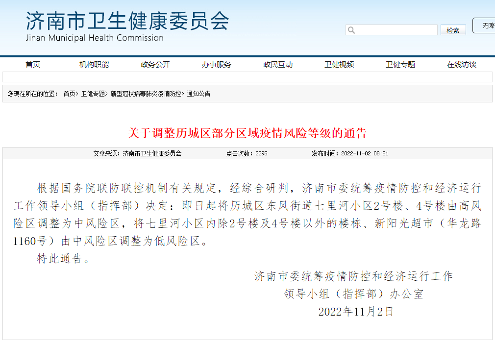 根据国务院联防联控机制有关规定,经综合研判,济南市委统筹疫情防控和经济运行工作领导小组(指挥部)决定:即日起将历城区东风街道七里河小区2号楼、4号楼由高风险区调整为中风险区,将七里河小区内除2号楼及4号楼以外的楼栋、新阳光超市(华龙路1160号)由中风险区调整为低风险区。