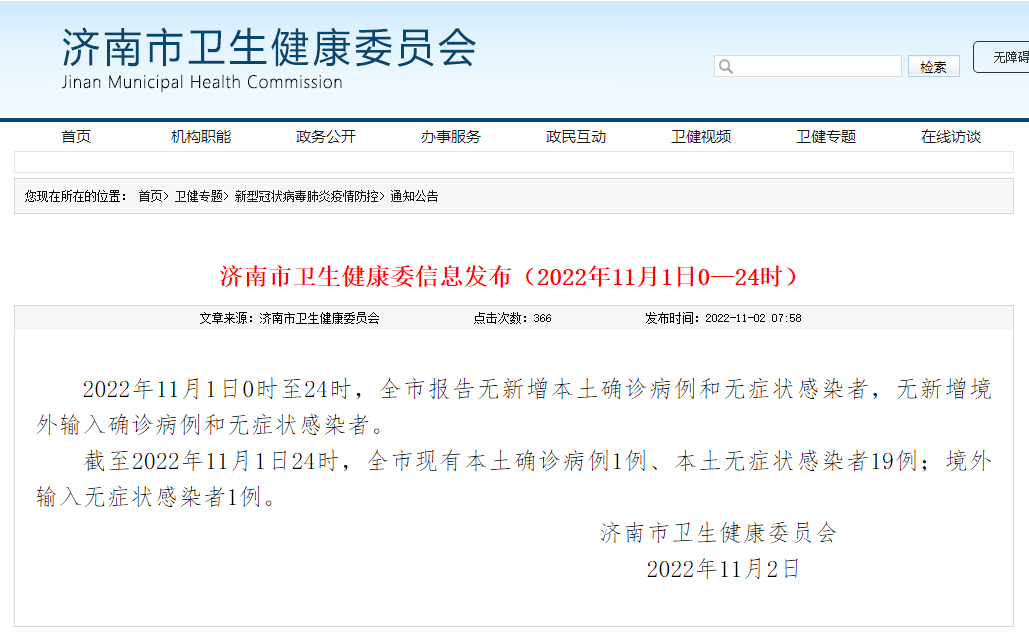 截至2022年11月1日24时,全市现有本土确诊病例1例、本土无症状感染者19例;境外输入无症状感染者1例。