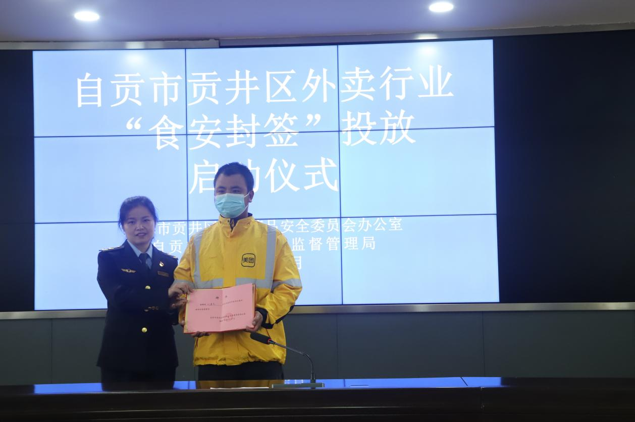近日,为推动外卖配送行业“食安封签”落地落实,保障网络餐饮食品安全“最后一公里”,自贡市贡井区外卖配送行业党委举行“以‘红色旗帜’护航食品安全”为主题的外卖行业“食安封签”投放启动仪式。