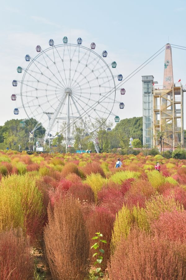 藏在武汉花博汇的浪漫摩天轮下,今年6月新栽种的地肤草已经由嫩绿色“小团子”长至半人多高,团团簇簇的“毛球”煞是可爱。百亩地肤进入转色期,变得多彩缤纷,金黄、嫩绿、玫红、浅咖……几乎集齐了一整个秋天的颜色。预计11月中旬,整片地肤草将变成更加热烈的红火色,将秋天的绚丽推向另一个高潮。