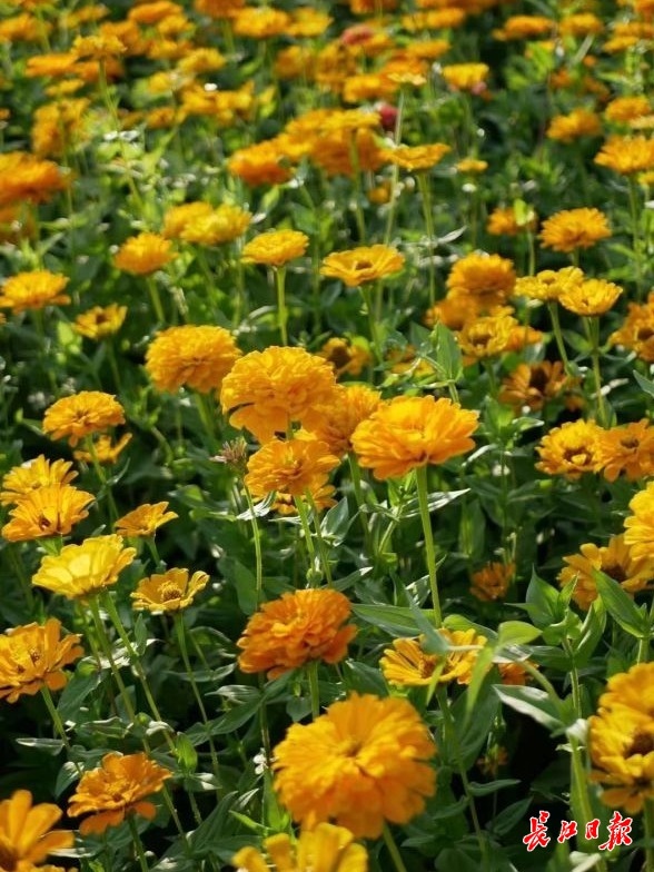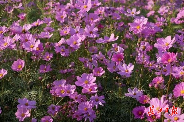 在汉口江滩四期,近百亩“大地花海”区,百日草、硫华菊、波斯菊、粉黛乱子草、鼠尾草等迎着秋日阳光灿烂盛开,金黄、橘黄、玫红、粉红、大红等多种颜色的花朵五彩斑斓。连绵的花海、湛蓝的天空、雄伟的大桥交相辉映,构成一幅绝美的秋日画卷,吸引市民徜徉其中,流连忘返。