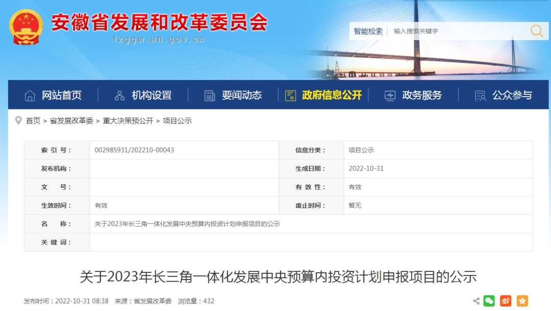 近日,据省发展改革委消息,我省拟申报2023年长三角一体化发展中央预算内投资计划的项目名单公示。