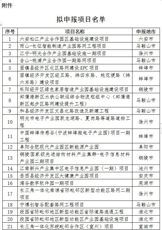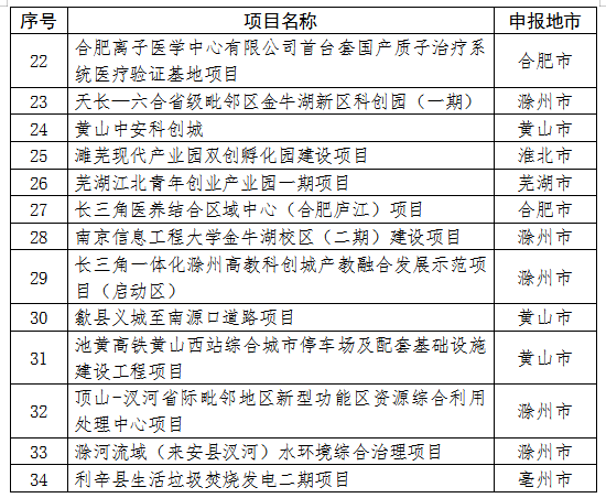 此次公示的项目共有34个,涉及合肥、六安、马鞍山、滁州、蚌埠、铜陵、阜阳、池州、安庆、芜湖、淮北、宣城、黄山、亳州等市。