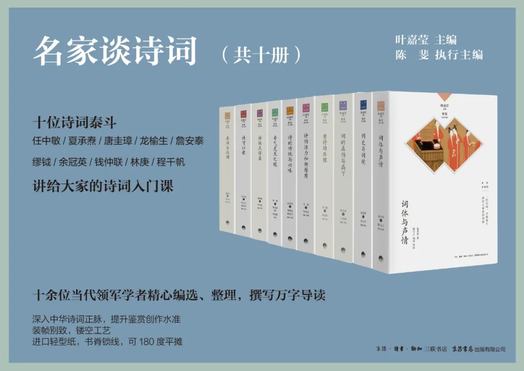 近期,生活书店推出“名家谈诗词”丛书,第一辑共10种。由“感动中国2020年度人物”、中华诗词学会名誉会长叶嘉莹主编、作序。作者是夏承焘、唐圭璋、龙榆生、程千帆、缪钺、钱仲联、詹安泰、余冠英、林庚、任中敏,可谓古典诗词研究领域的一代宗师、泰斗。这套丛书可视为他们讲给大家的古诗词入门课,人人都能读懂,由此轻松品悟古典诗词之大美。