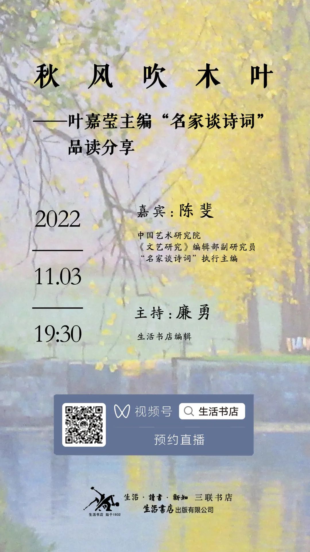 11月3日 晚,“名家谈诗词”执行主编、中国艺术研究院《文艺研究》编辑部陈斐副研究员,做客生活书店视频号直播间,与大家分享中华诗词之美。
