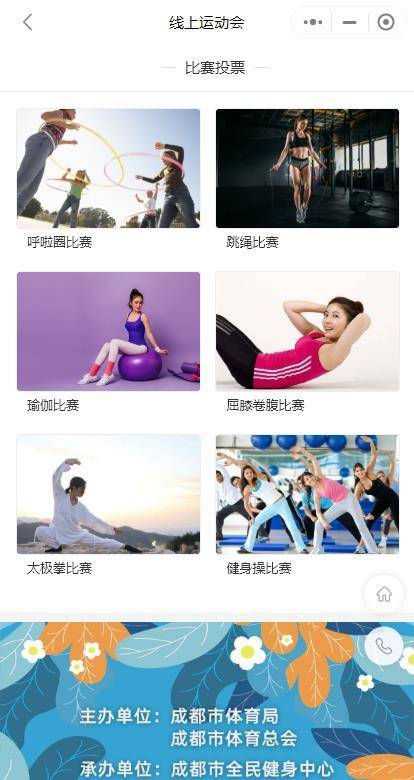 据悉,本次线上运动会面向所有市民开放,分别设置了跳绳、太极拳、健身操、瑜伽、呼啦圈、屈膝卷腹6个项目,既符合广大市民的居家健身要求,同时满足了各年龄段的市民参与,进一步带动大家的参与热情。参与过程也非常简单,参赛者登录小程序后,可根据自身喜好,在平台上首页“我要参与”页面选择自己喜欢的项目,然后进行项目锻炼并录制好视频,再将视频发布到小程序上即可。