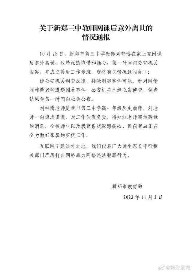 据“新郑发布”通报:10月28日,新郑市第三中学教师刘韩博在家上完网课后意外离世,我局深感婉惜和痛心,第一时间向公安机关报案,并成立善后工作专班,现将有关情况通报如下:经公安机关调查反馈,排除刑事案件可能。针对网传刘韩博老师遭遇网暴事件,公安机关已经立案侦查,调查结果会第一时间向社会公布。
