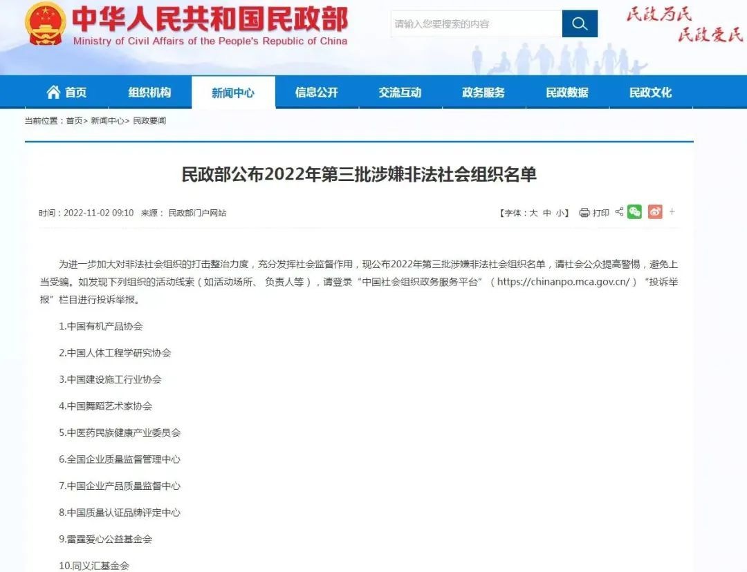 民政部2日公布2022年第三批涉嫌非法社会组织名单,包含中国舞蹈艺术家协会等10家。