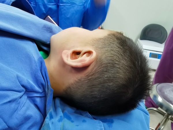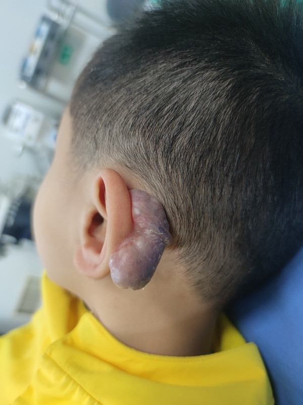 4岁的斌斌在1岁时因意外左耳后部受伤,伤口愈合后出现不规则的疤痕,起初家长并没有特别加以重视,直到渐渐凸起,父母才开始担心,并将孩子带到医院进行相关治疗,但效果并不理想,疤痕仍然持续增大。不到3年瘢痕异常增长迅速,突起如同“第三只耳朵”依附在斌斌的左耳后。
