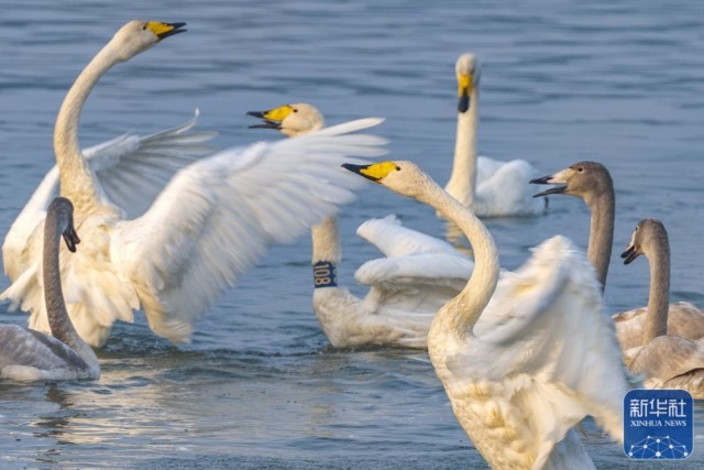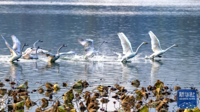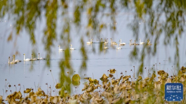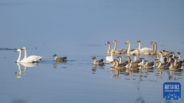 ↑11月1日,白天鹅在河南三门峡市天鹅湖国家城市湿地公园与其它鸟类和谐相处。