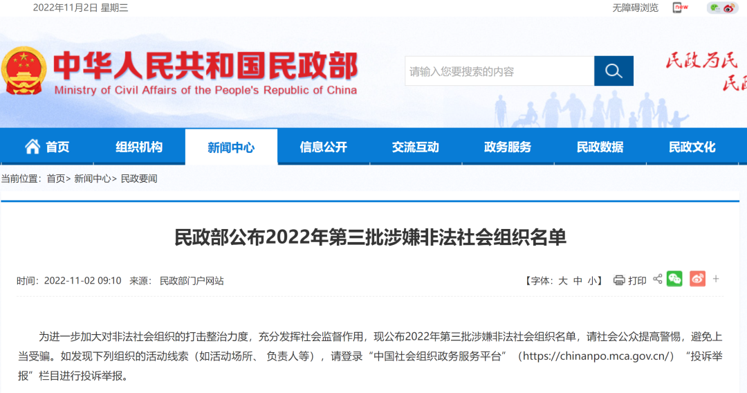 如发现以上组织的活动线索(如活动场所、 负责人等),请登录“中国社会组织政务服务平台”(https://chinanpo.mca.gov.cn/)“投诉举报”栏目进行投诉举报。