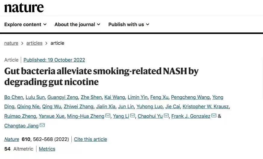 日前,北京大学基础医学院、北京大学第三医院医学创新研究院姜长涛教授团队与合作者在《自然》发表《肠道菌群通过降解尼古丁,改善吸烟加重的非酒精性脂肪性肝炎》研究长文,首次揭示了吸烟期间尼古丁在肠道中累积,通过“肠—肝”对话促进NASH的关键机制。