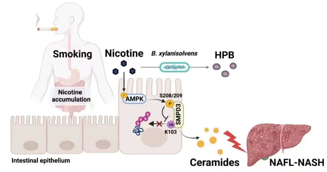 非酒精性脂肪肝(NAFL)已成为威胁人类健康的重大代谢性疾病。如不加以干预和治疗,NAFL会进一步进展为非酒精性脂肪肝炎(NASH),继而诱发不可逆的肝硬化甚至肝癌。多项临床研究表明,吸烟与非酒精性脂肪肝炎(NASH)进展密切相关,但其分子机制尚不清楚,而且缺乏有效干预策略。