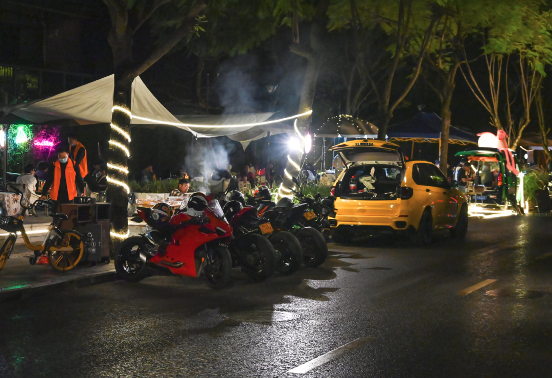 户外桌椅板凳、后备箱橱窗、手打柠檬茶、海岛风桌灯、调制酒、帐篷……“露营风”的布置让三色路夜市持续散发着吸引力。