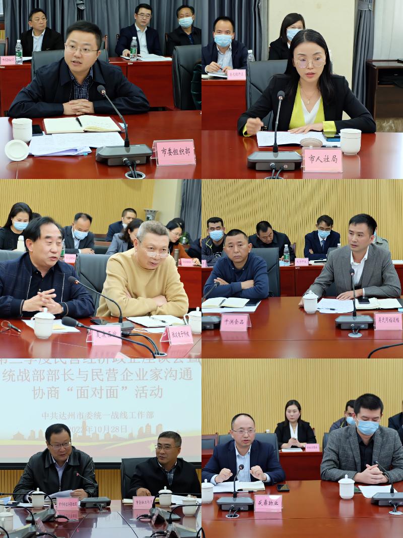 10月28日,达州市委统战部召开2022年第三季度民营经济政企座谈会暨统战部部长与民营企业家沟通协商“面对面”活动,组织政府部门与民营企业面对面恳谈,进一步畅通政企沟通渠道,破解民营企业发展难题。市委常委、统战部部长王蔚荩出席会议并讲话,会议由市委统战部常务副部长柏相臣主持。