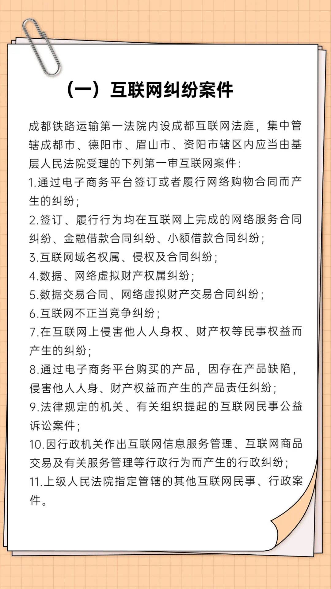 成都铁路运输第一法院内设成都互联网法庭,集中管辖成都市、德阳市、眉山市、资阳市辖区内应当由基层人民法院受理的下列第一审互联网案件: