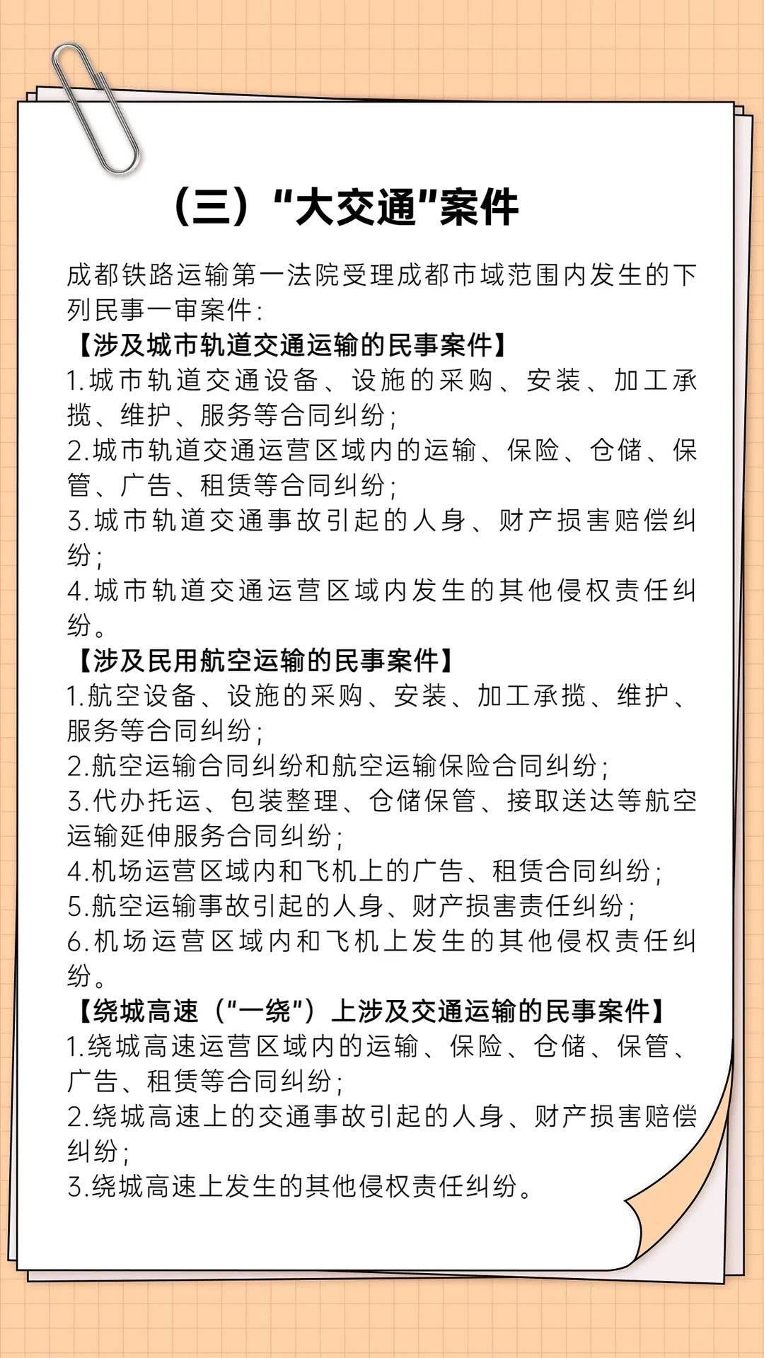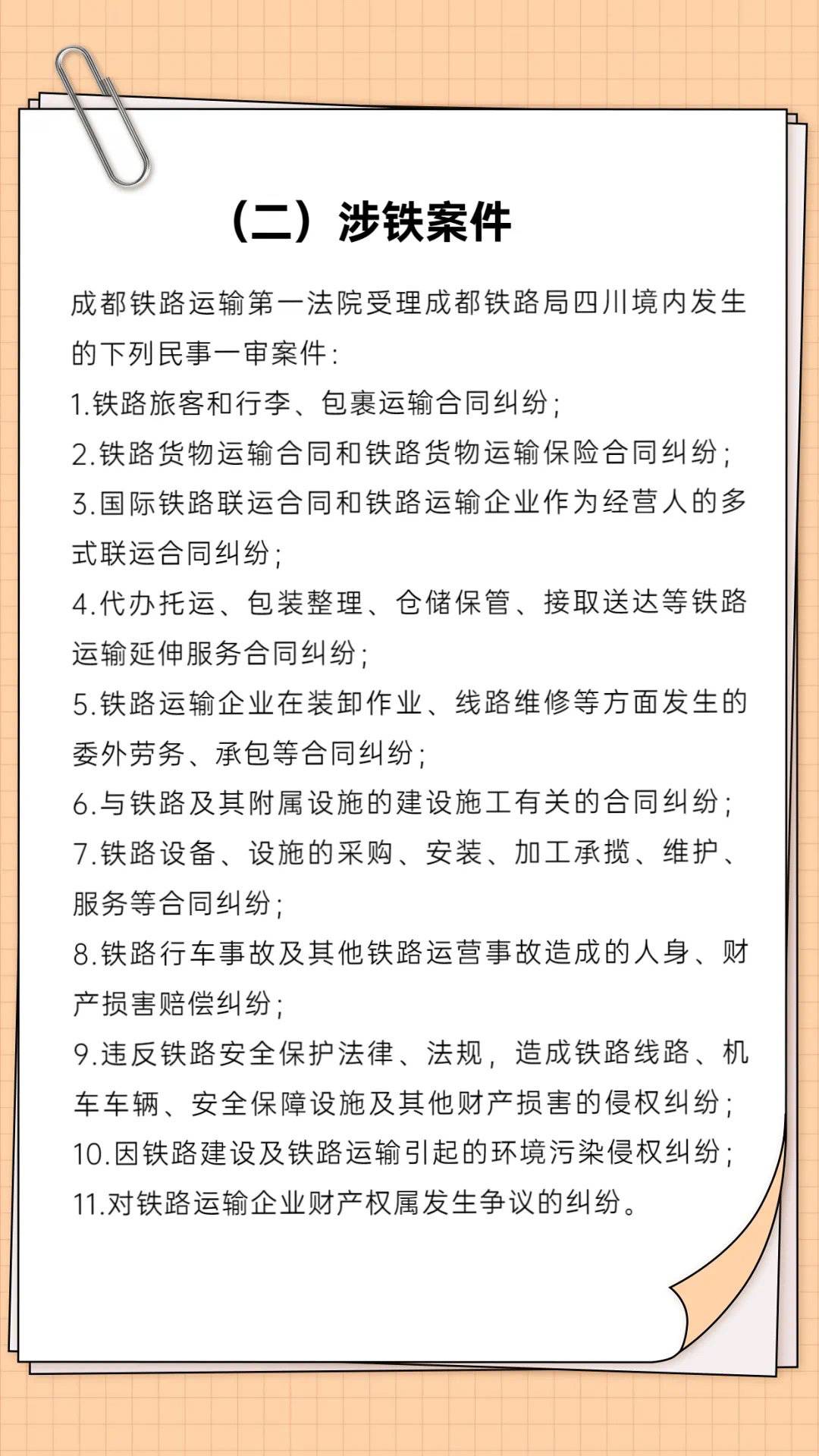 11月2日,记者从成都铁路运输第一法院(成都互联网法庭)获悉,为进一步向办事群众释明法院民事、执行案件管辖范围,方便当事人选择诉讼服务,更好地发挥法院审判职能,成铁第一法院公布了相关管辖案件范围,以下是具体内容。