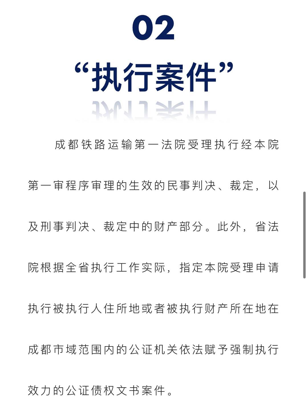 成都铁路运输第一法院受理执行经本院第一审程序审理的生效的民事判决、裁定,以及刑事判决、裁定中的财产部分。此外,省法院根据全省执行工作实际,指定本院受理申请执行被执行人住所地或者被执行财产所在地在成都市域范围内的公证机关依法赋予强制执行效力的公证债权文书案件。