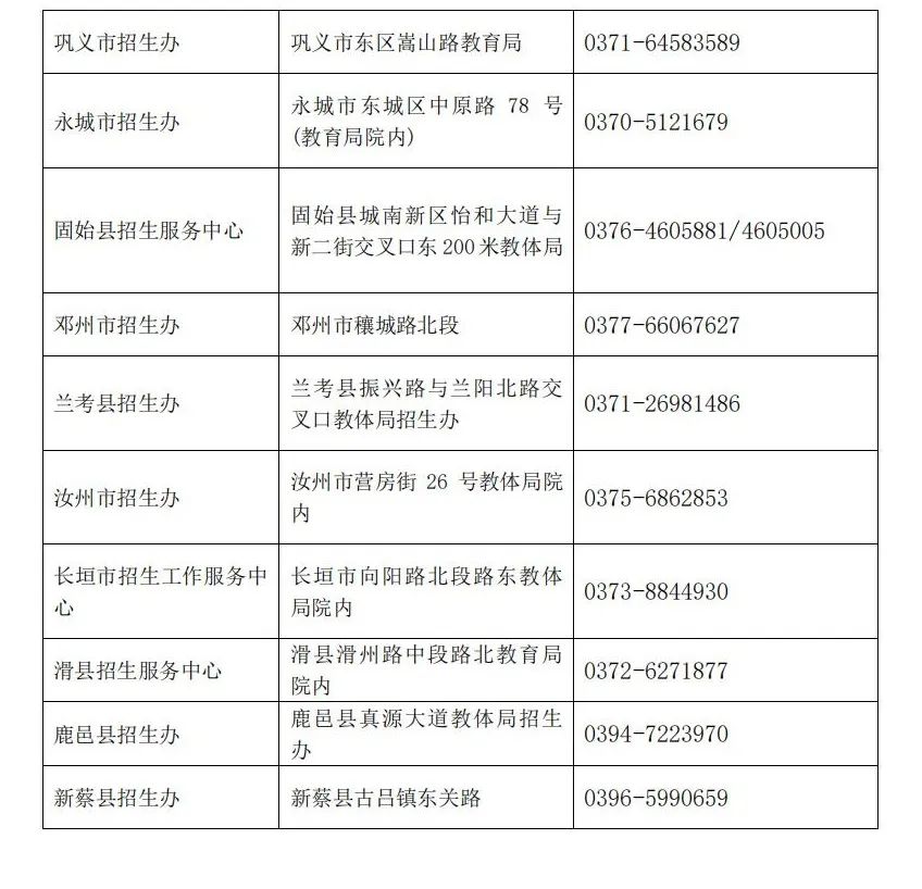 附:河南省2022年全国成人高校招生考试各地教育招生考试机构咨询电话
