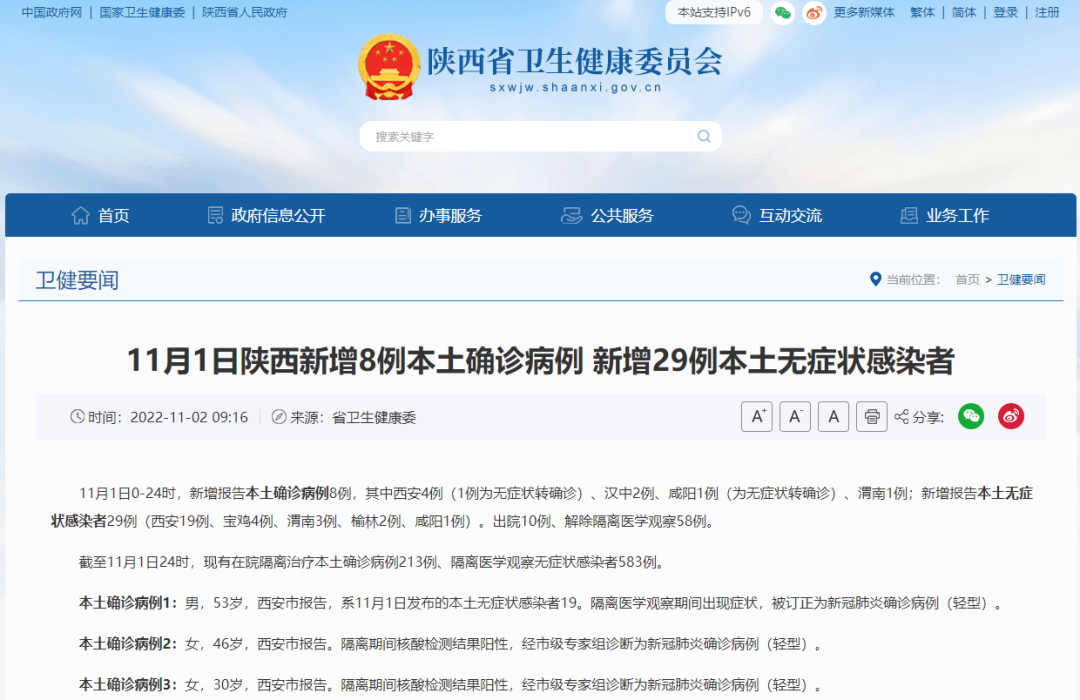 11月1日0-24时,新增报告本土确诊病例8例,其中西安4例(1例为无症状转确诊)、汉中2例、咸阳1例(为无症状转确诊)、渭南1例;新增报告本土无症状感染者29例(西安19例、宝鸡4例、渭南3例、榆林2例、咸阳1例)。出院10例、解除隔离医学观察58例。