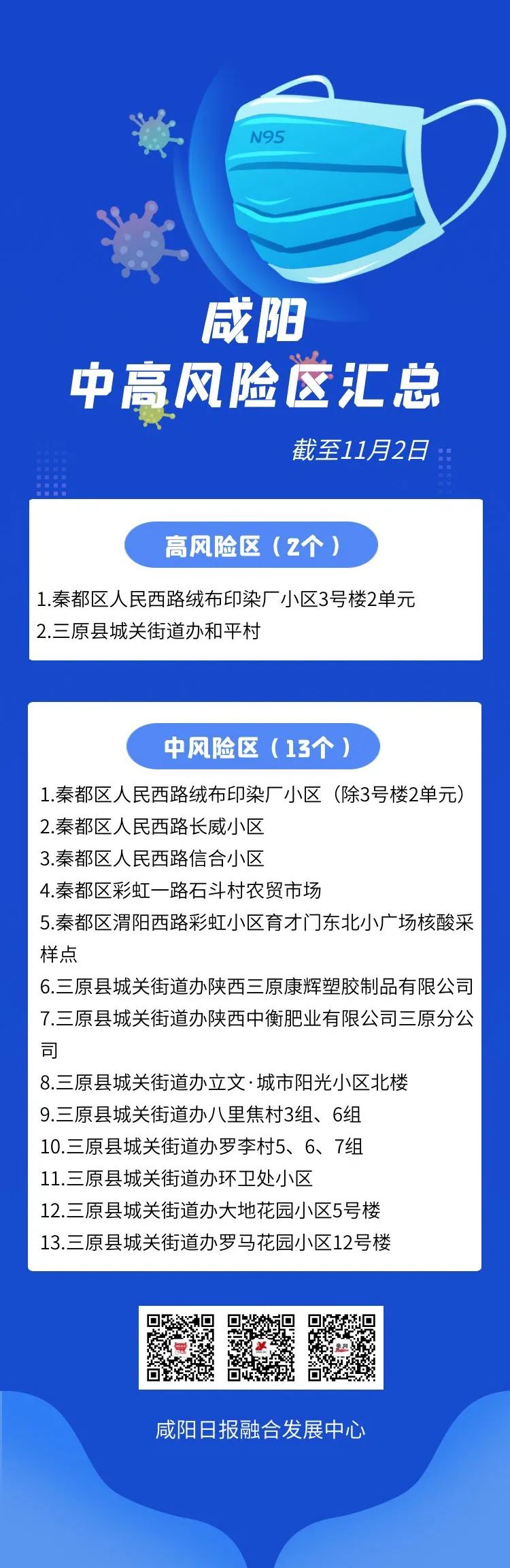 根据国务院联防联控机制有关规定,经市级专家组综合评估,咸阳市疫情防控指挥部研究决定,自2022年11月2日起,划定、调整我市部分地区疫情风险等级。具体名单如下: