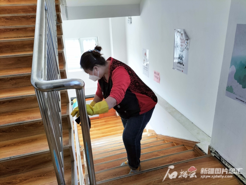 11月1日,柯坪路北社区组织人员对小区楼梯扶手进行擦拭消毒。 通讯员 余军丽 摄