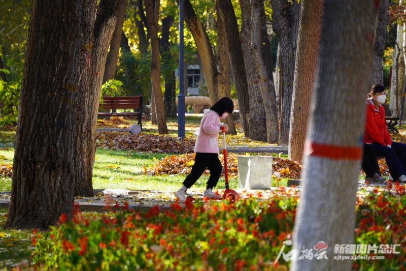 在伊宁市人民公园,居民散步或坐在椅子上寒暄,也有园林工人在清扫落叶。伊宁市城市管理局园林中心副主任、人民公园主任王克军告诉记者,疫情期间园林职工一直坚守岗位,开展全市公共绿地养护管理,守护城市园林成果。