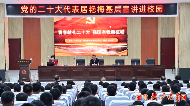10月28日,在故城县郑口中学综合楼阶梯教室内,居艳梅从参加党的二十大、在河北代表团讨论会上发言、接受媒体采访等方面,以鲜活的事例、通俗的语言、真切的情感生动讲述了切身感受,与同学们互动交流,对大会精神进行学习解读、宣传阐释。居艳梅表示,希望通过宣讲党的二十大精神,使学生们树立远大理想,努力成为对社会有用的人、道德高尚的人,勇敢肩负起时代赋予的重任,在实现中华民族伟大复兴的中国梦的生动实践中放飞青春梦想。