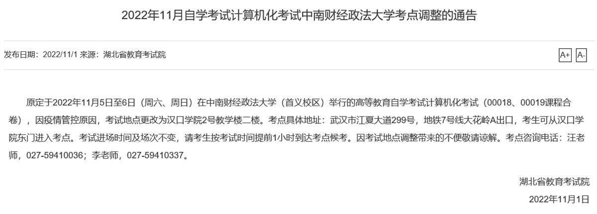 极目新闻记者11月2日从湖北省教育考试院获悉,原定于2022年11月5日至6日(周六、周日)在中南财经政法大学(首义校区)举行的高等教育自学考试计算机化考试(00018、00019课程合卷),因疫情管控原因,考试地点更改为汉口学院2号教学楼二楼。