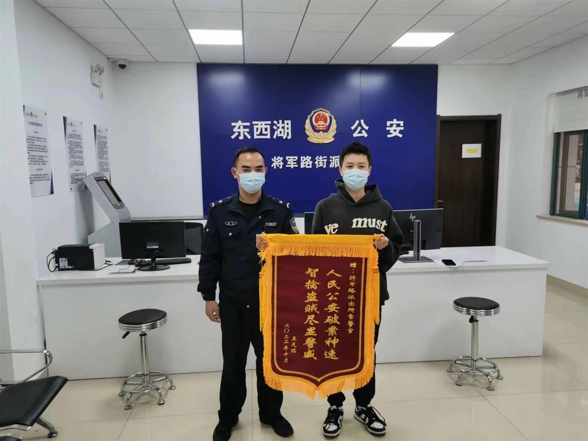 “人民公安破案神速,智擒盗贼尽显警威。”近日,武汉市东西湖区将军路街居民王先生,特意带着一面锦旗送到将军路街派出所,感谢民警为其找回被盗的电动车。
