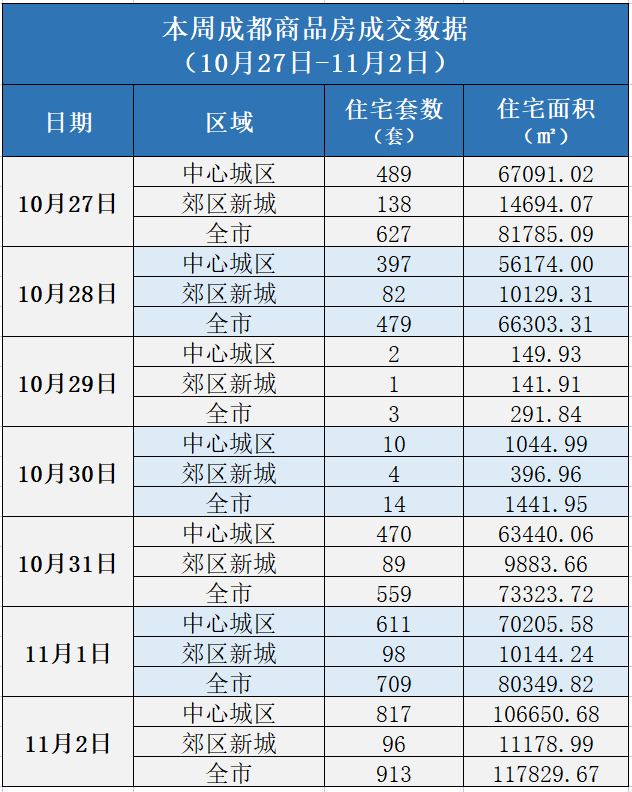 本周(10月27日-11月3日),成都商品房成交总套数3304套,环比上周上涨27.9%,成交总面积421325.40㎡,环比上涨18%。