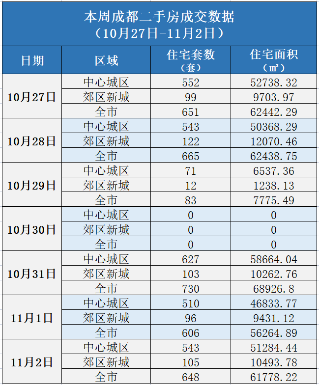 本周(10月27日-11月3日),成都二手房成交总套数3383套,环比上周下降9%,成交总面积319626.44㎡,环比上周下降约9%。本周成都二手房成交总数超过商品房,但成交总面积比新房少了10168.96㎡。