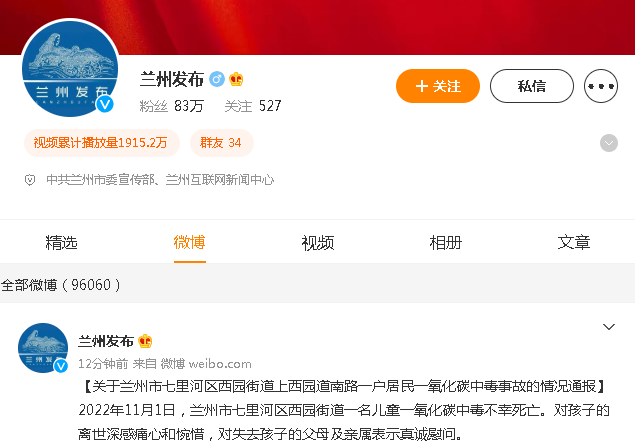 2022年11月1日,兰州市七里河区西园街道一名儿童一氧化碳中毒不幸死亡。对孩子的离世深感痛心和惋惜,对失去孩子的父母及亲属表示真诚慰问。