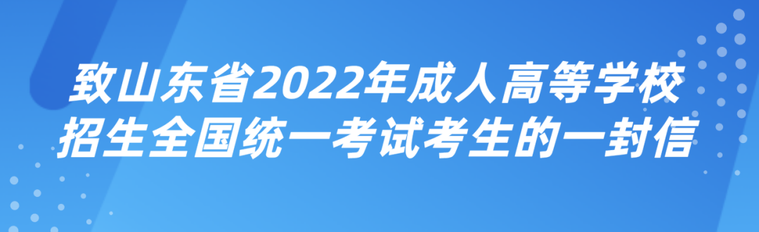 请提前了解考试所在市防疫政策和要求,提前做好相关准备。如有《致山东省2022年成人高等学校招生全国统一考试考生的一封信》所列特殊情况请及时向考试所在市教育招生考试机构报备。