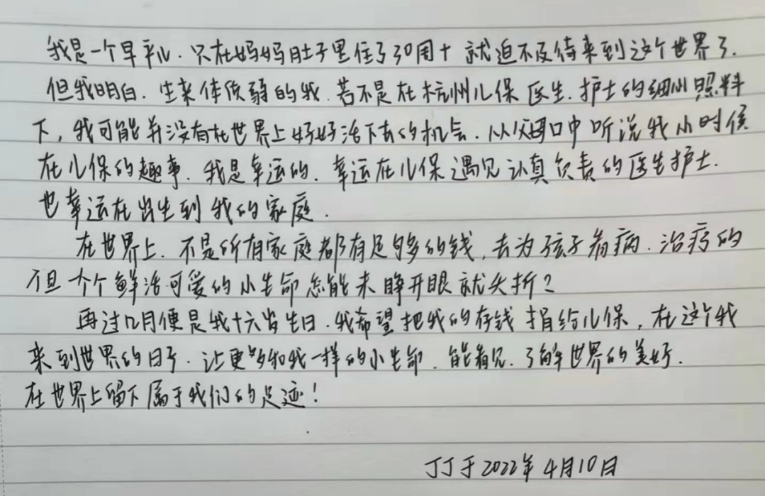 这份爱心来自湖州安吉的一名中学生丁子越,一个曾经在NICU住院的早产儿。子越出生于2006年,在今年5月马上就要过16周岁生日的时候,决定送给自己一个不一般的“成人礼”——把从小攒下的十万块压岁钱悉数拿出,资助浙大儿院重疾贫困早产儿的救治。“希望更多和我一样的小生命能看见、了解世界的美好,在世界上留下属于我们的足迹!”她在自己的日记中写道。