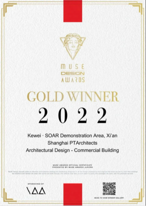 近日,全球建筑与设计领域最具影响力的国际奖项之一“美国缪斯设计奖MUSE Design Awards”2022获奖名单揭晓SOAR Smart Valley Entrepreneurs Salon(翱翔小镇智汇谷创业家沙龙建筑)荣获金奖。
